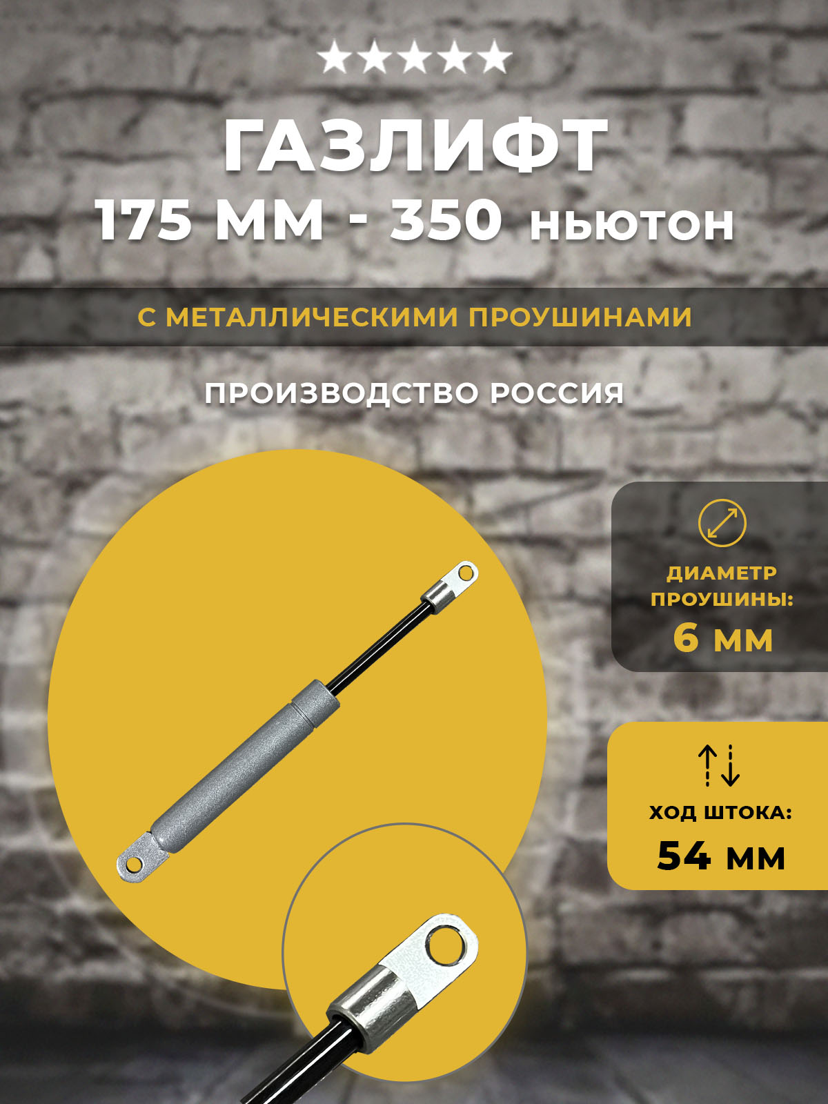 Газлифт для мебели, техники, и других предназначений. Проушина 6 мм. Длина газлифта: 175 мм по центрам отверстий крепления. Ход штока: 54 мм. Диаметр штока/гильзы: 6/15 мм. Цвет гильзы: серый. Нагрузка примерно 35 кг с учетом рычага подъема.