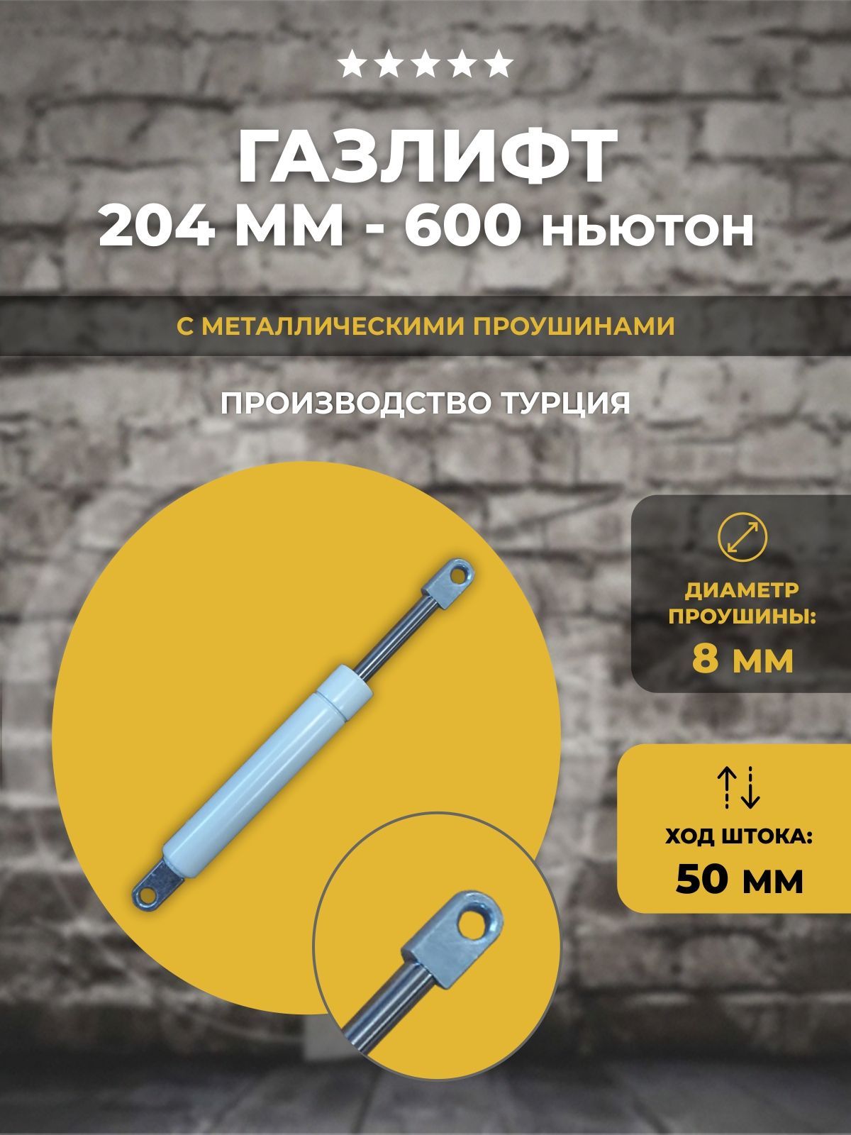 Газлифт для мебели, техники, и других предназначений. Проушина 8 мм. Длина газлифта: 204 мм по центрам отверстий крепления. Ход штока: 50 мм. Диаметр штока/гильзы: 10/21 мм. Цвет гильзы: черный. Нагрузка примерно 60 кг с учетом рычага подъема.