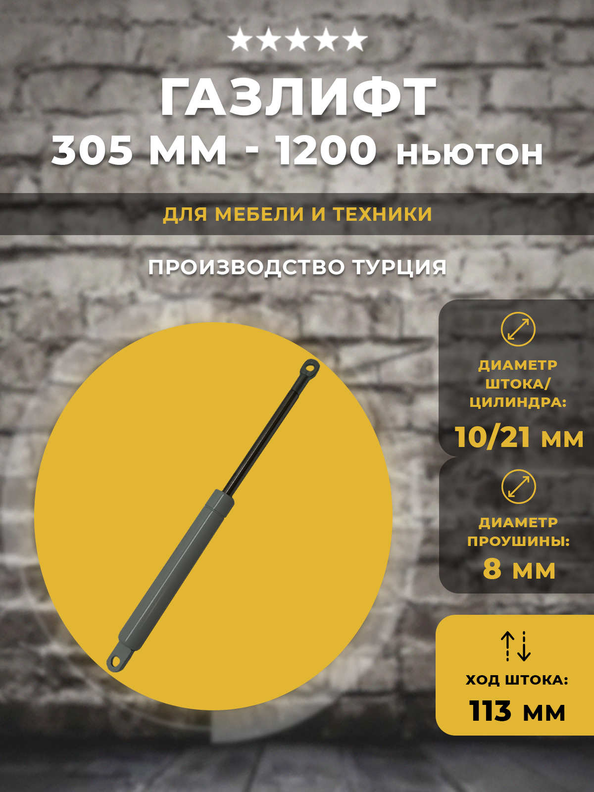 Газлифт для мебели, техники, и других предназначений. Проушина 8 мм. Длина газлифта: 305 мм по центрам отверстий крепления. Ход штока: 113 мм. Диаметр штока/гильзы: 10/21 мм. Цвет гильзы: серый. Нагрузка примерно 120 кг с учетом рычага подъема.