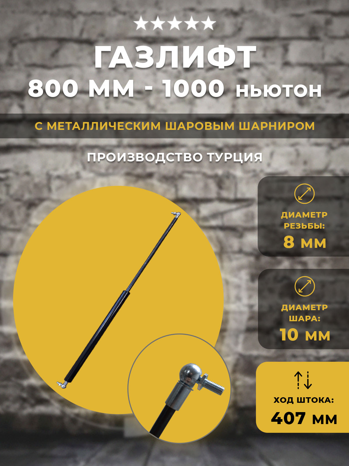 Газлифт для люков, техники, и других предназначений. Шариковый шарнир 10 мм с резьбовым пальцем 8 мм. Длина газлифта: 800 мм по центрам креплений. Ход штока: 407 мм. Диаметр штока/гильзы: 10/21мм. Цвет гильзы: черный. Нагрузка примерно 100 кг с учетом рычага подъема.