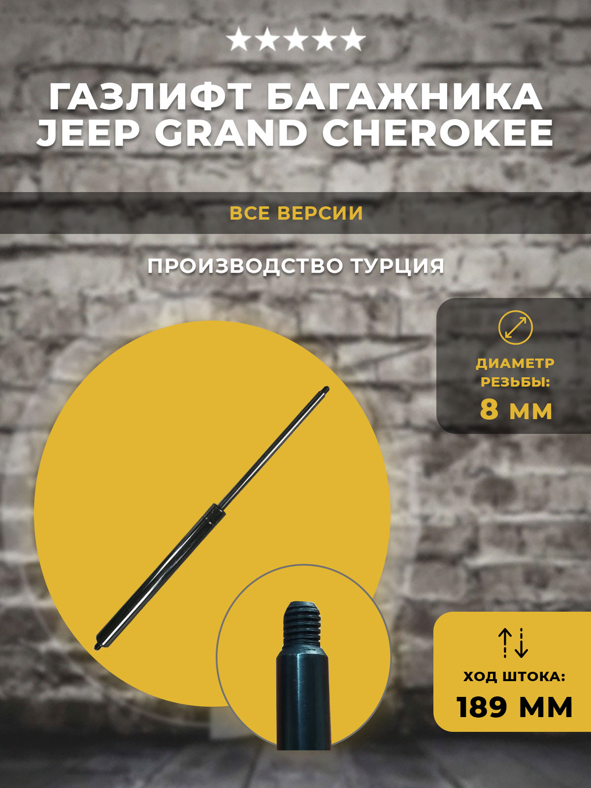 Газлифт для багажника автомобиля Jeep Grand Cherokee и другой техники. С резьбой 8 мм с обеих концов. Длина газлифта: 438 мм. Ход штока: 189 мм. Диаметр штока/гильзы: 10/21 мм. Цвет гильзы: черный. Нагрузка примерно 86 кг с учетом рычага подъема.