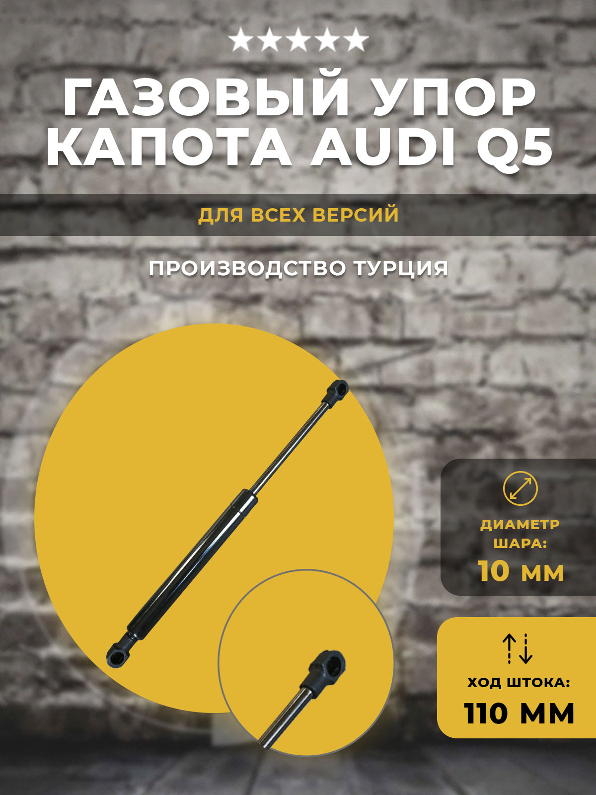 Газлифт для капота автомобиля Audi Q5 всех версий, и другой техники. Под шариковый шарнир 10 мм Длина газлифта: 305 мм по центрам креплений. Ход штока: 110 мм. Диаметр штока/гильзы: 8/18 мм. Цвет гильзы: черный. Нагрузка примерно 38 кг с учетом рычага подъема.