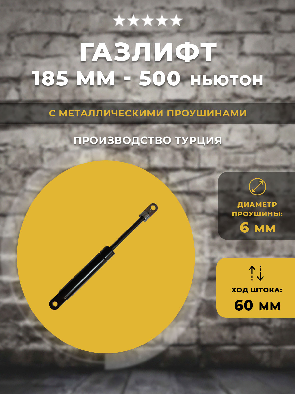 Газлифт для мебели, техники, и других предназначений. Проушина 6 мм. Длина газлифта: 185 мм по центрам отверстий крепления. Ход штока: 60 мм. Диаметр штока/гильзы: 6/15 мм. Цвет гильзы: серый. Нагрузка примерно 50 кг с учетом рычага подъема.
