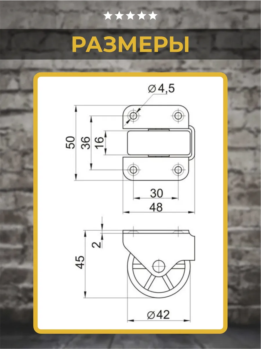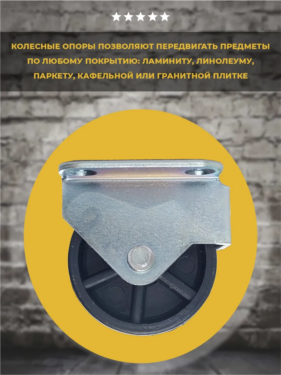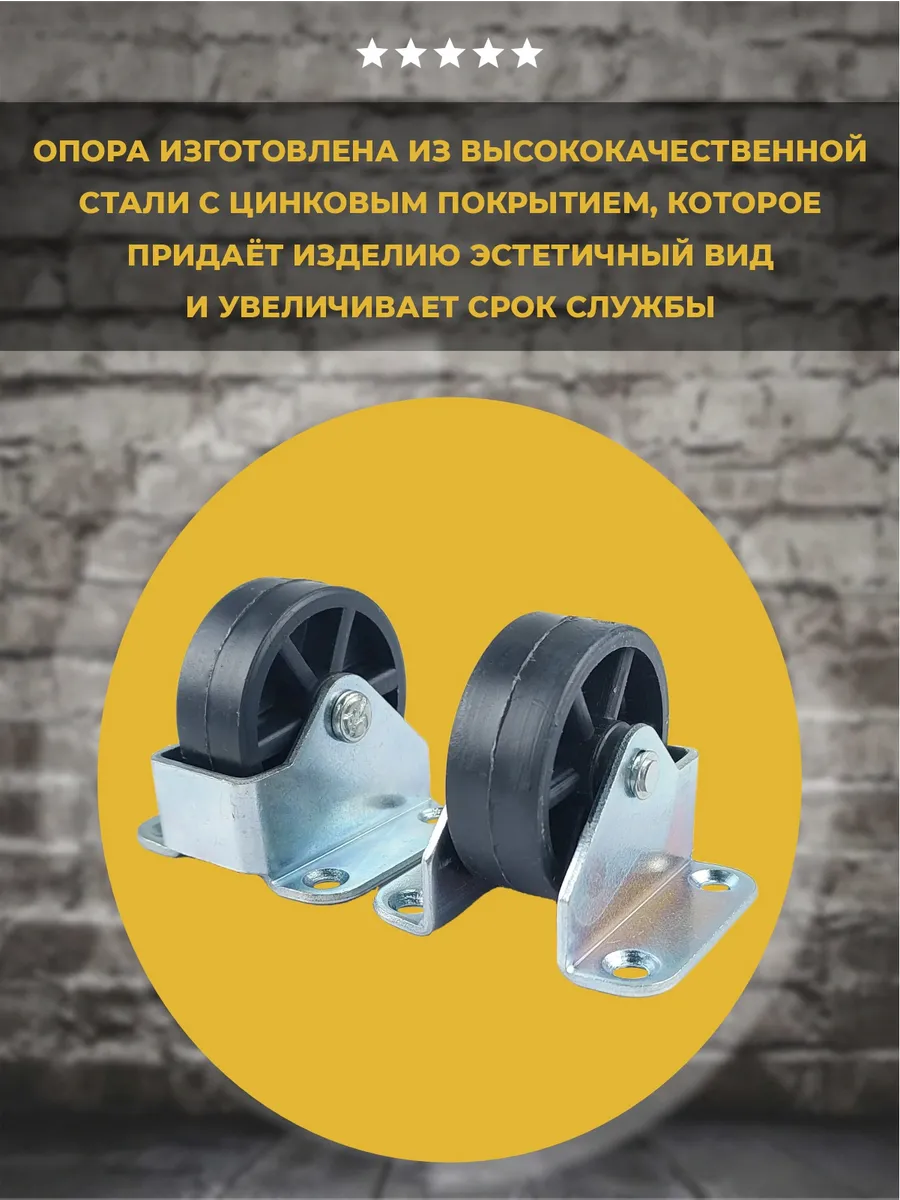 Опора изготовлена из высококачественной стали с цинковым покрытием, которое придаёт изделию эстетичный вид и увеличивает срок службы. Колесо выполнено изпрочного пластика, что обеспечивает плавный ход без следов на напольном покрытии. Максимальная нагрузка на опору составляет 25 кг. Диаметр колеса 42мм. В комплекте 2 шт.