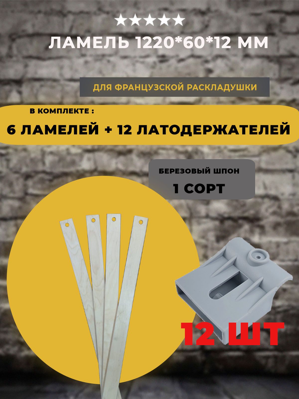 Ламель для французской и американской раскладушек размером 1220*60*12 мм (комплект 6 шт) + латодержатели на трубу диаметром 25 мм (комплект 12 штук).