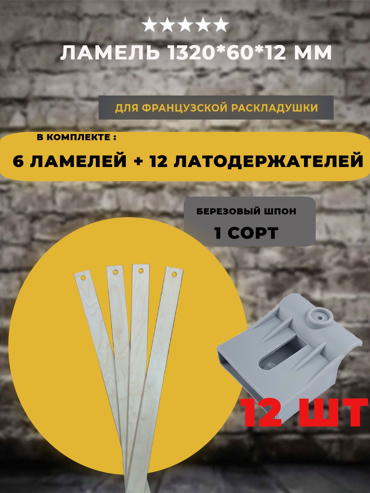 Ламель для французской и американской раскладушек размером 1320*60*12 мм (комплект 6 шт) + латодержатели на трубу диаметром 25 мм (комплект 12 штук).