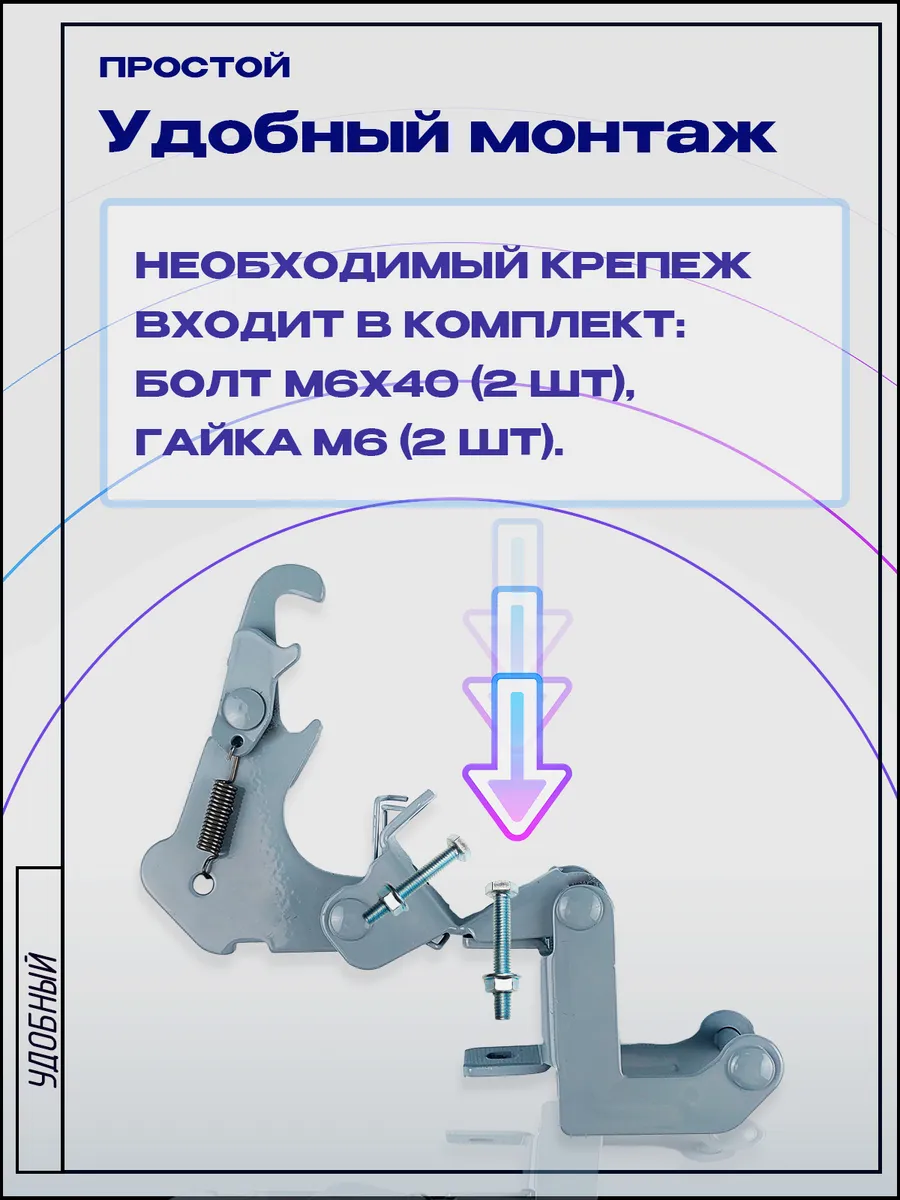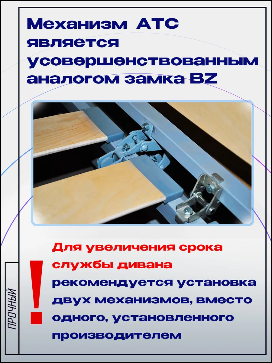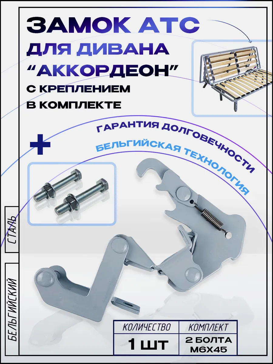 В набор входят все необходимые элементы для монтажа: Замок АТС премиального качества Полный набор крепежных элементов (2 болта М6х40 мм и 2 гайки М6). Рекомендации по установке: Для максимальной надежности рекомендуется монтаж двух механизмов вместо стандартного одного. Второй замок устанавливается вместо петли АТС на трубу размером 20×30 мм. Инвестируйте в комфорт и долговечность вашего дивана с замком АТС!