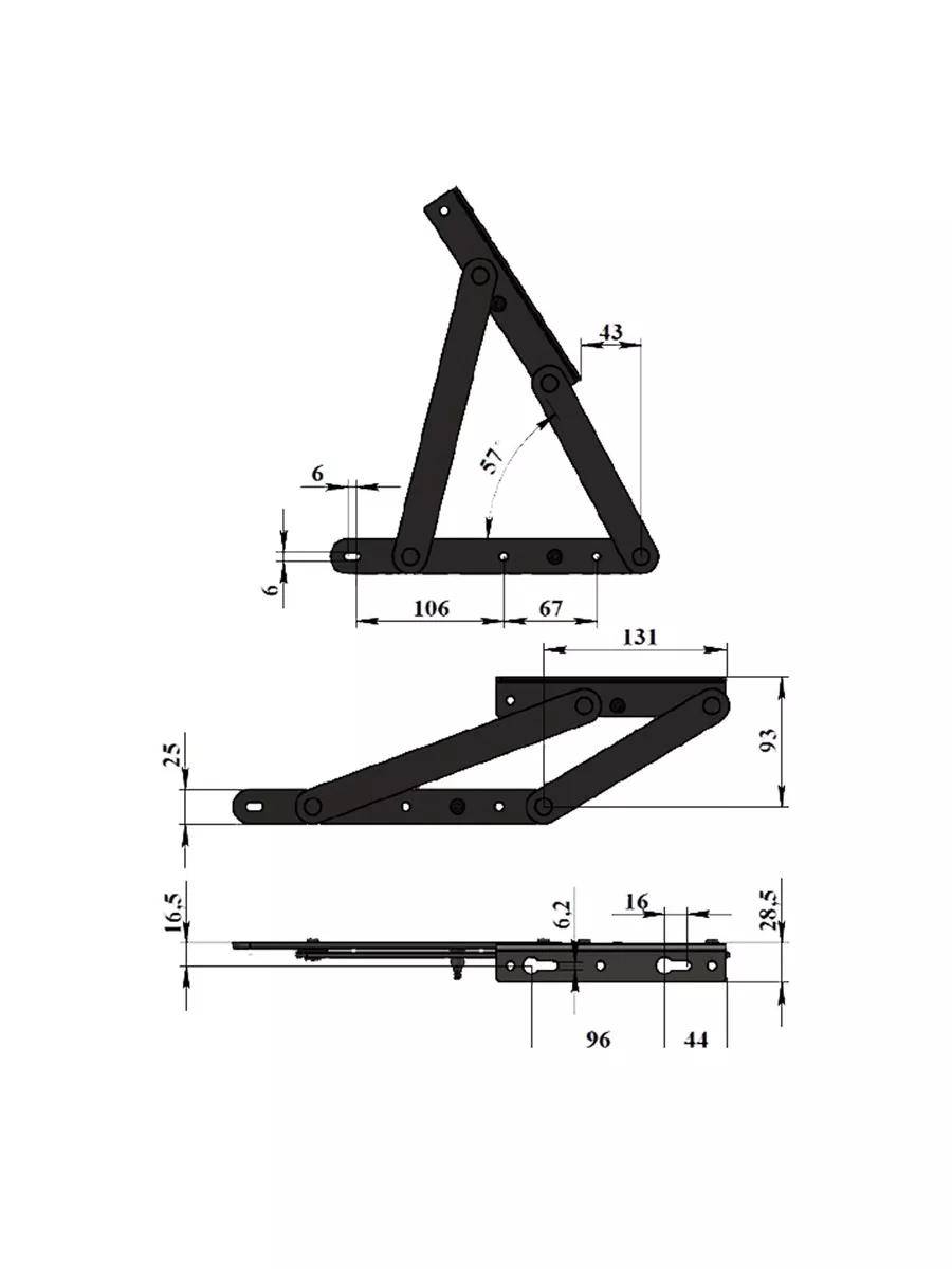 Предельная динамическая нагрузка 600 Ньютон (60 кг). Компактные размеры позволяют сделать поперечную установку механизма. Данный механизм дополнительно комплектуется газлифтами 185 мм, усилием 200,300,400,500 ньютон (в комплект не входят, т.к. подбираются индивидуально по необходимому усилию).