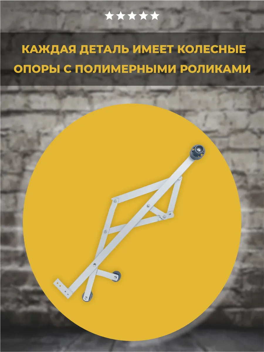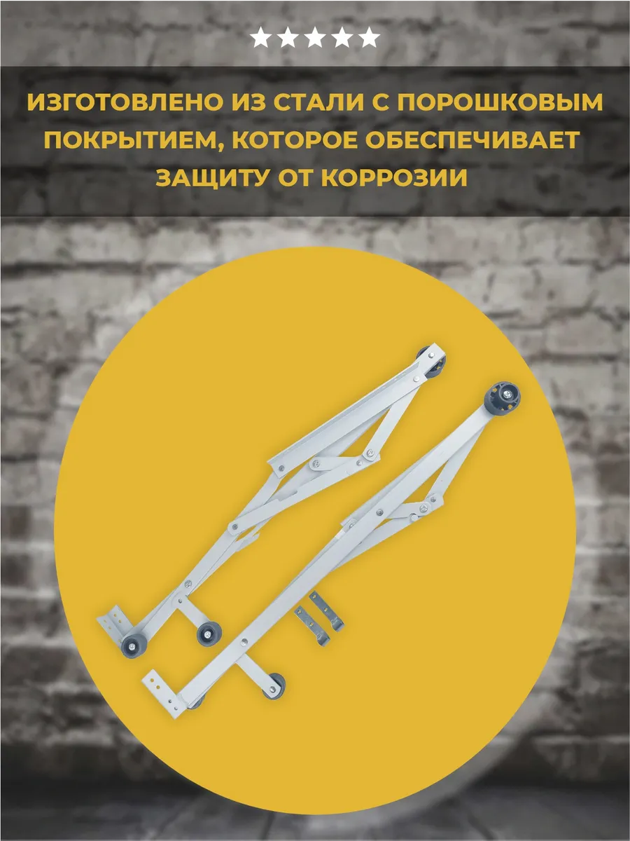 Трансформация не требует особых усилий. Механизм предназначен для ежедневного использования. В процессе работы он испытывает огромные нагрузки, поэтому его изготавливают из прочной стали с полимерным покрытием. Порошковая покраска обеспечивает защиту от коррозии. Основные элементы детали выполнены методом холодной штамповки. Комплект конструкции состоит из правого и левого механизма и 2 зацепов (стопоров). Каждая их деталей имеет колесные опоры, ролики которых сделаны из полимерного материала.