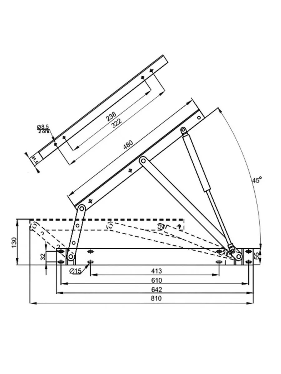 Длина нижнего основания: 663 мм. Длина верхнего: 480 мм. Угол открытия: 45 градусов. Усилие газлифтов: на выбор.