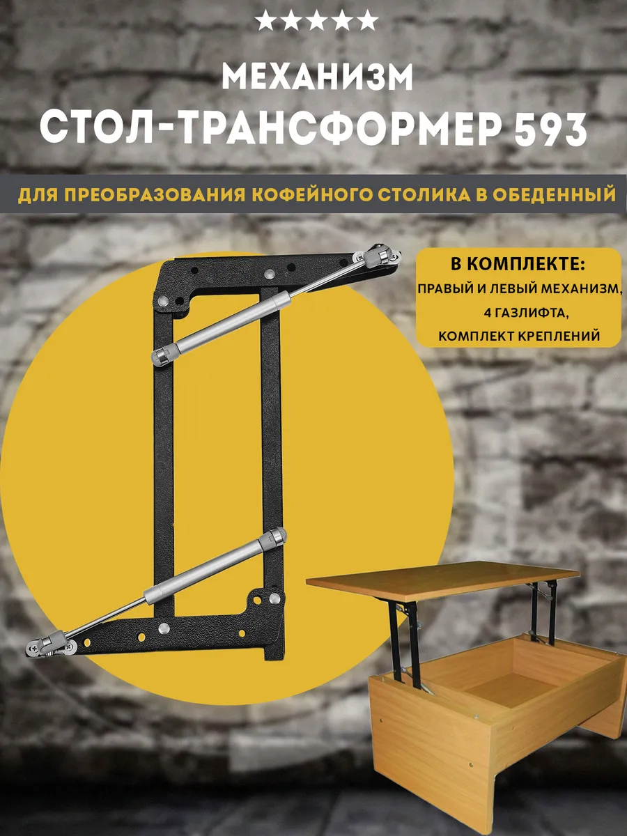 Механизм № 593 трансформации стола производит преобразование журнального столика в обеденный или рабочий стол.