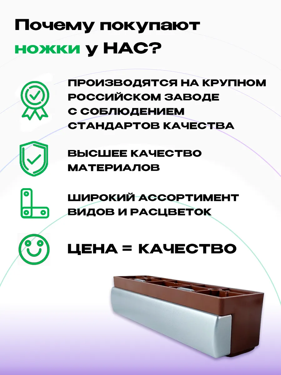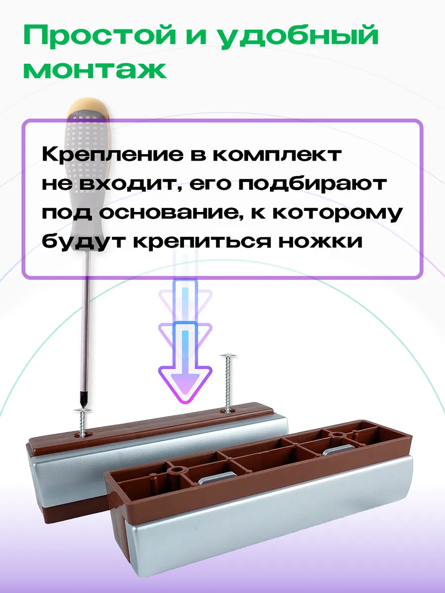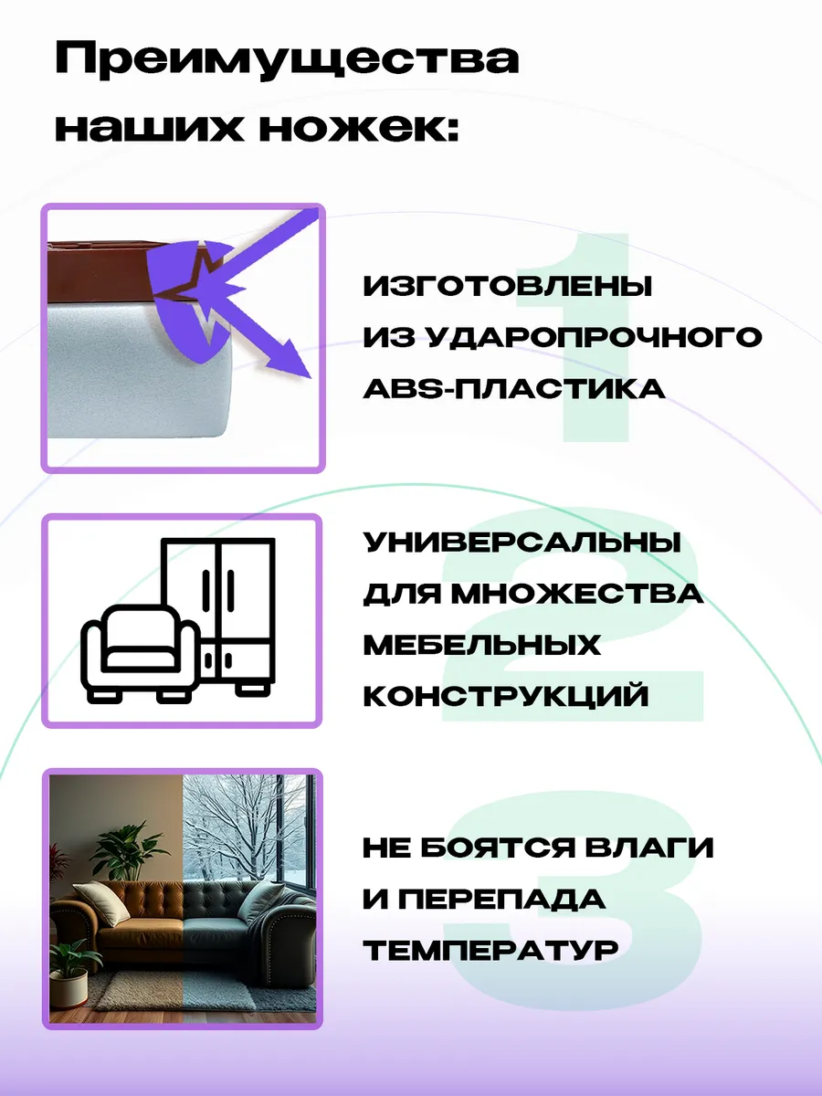Наши ножки изготовлены из высококачественного ударопрочного ABS-пластика коричневого цвета. Этот материал не только прочен и долговечен, но и устойчив к воздействию воды и моющих средств. Он хорошо переносит высокие и низкие температуры, что гарантирует надёжность и долговечность наших ножек.