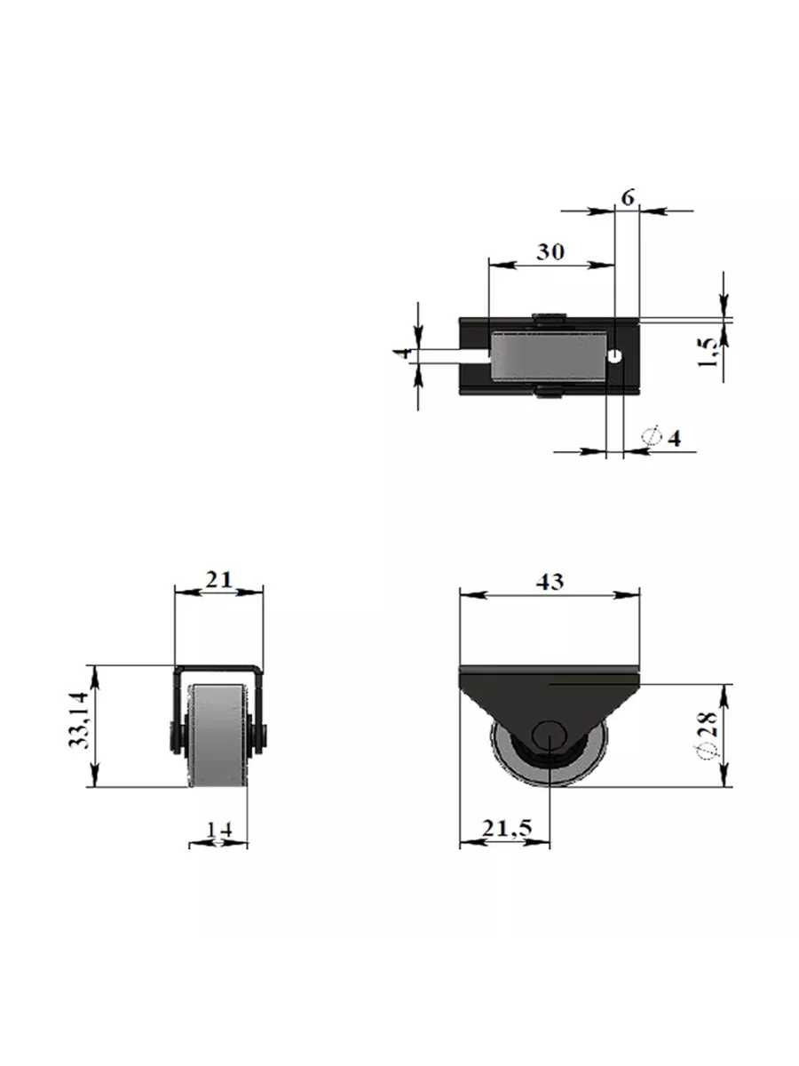 Толщина комплектующих: скоба: толщина 1,5мм., ось-заклепка: диаметр 6мм., колесо С-286: диаметр 28мм.