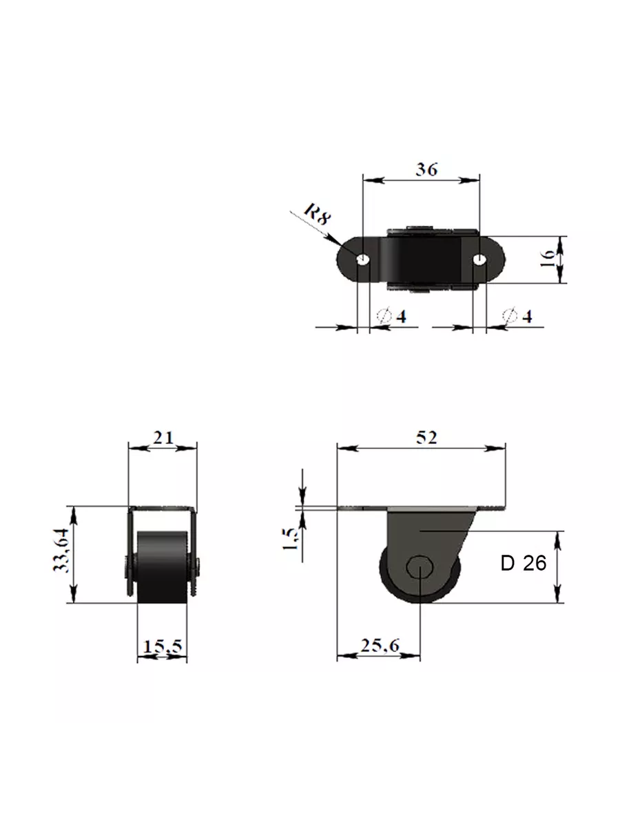 Толщина комплектующих: скоба: толщина 1,5мм., ось-заклепка: диаметр 6мм., колесо П-256: диаметр 26мм.