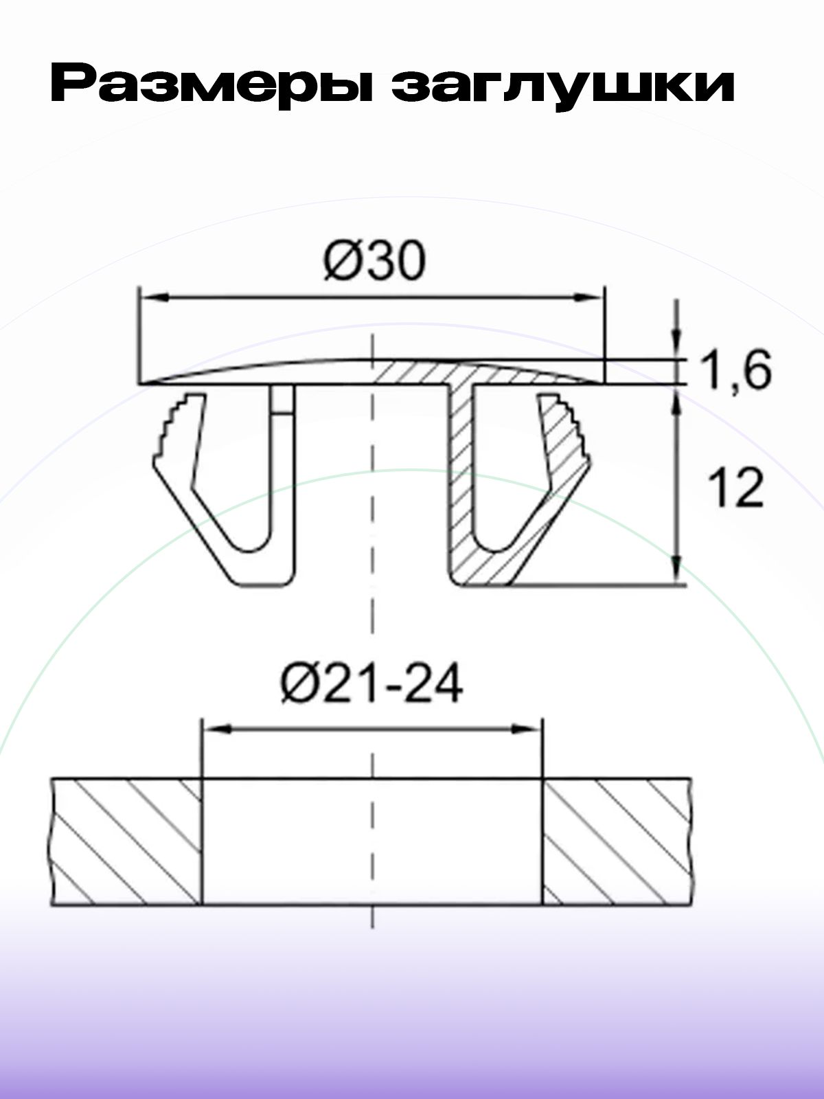 Конструкция заглушки включает специально разработанные ребра, обеспечивающие легкость монтажа и высокую степень фиксации. Это достигается благодаря оптимальной геометрии и материалам, что позволяет надежно интегрировать заглушку в различные поверхности, включая листовой металл и другие конструкционные материалы.
