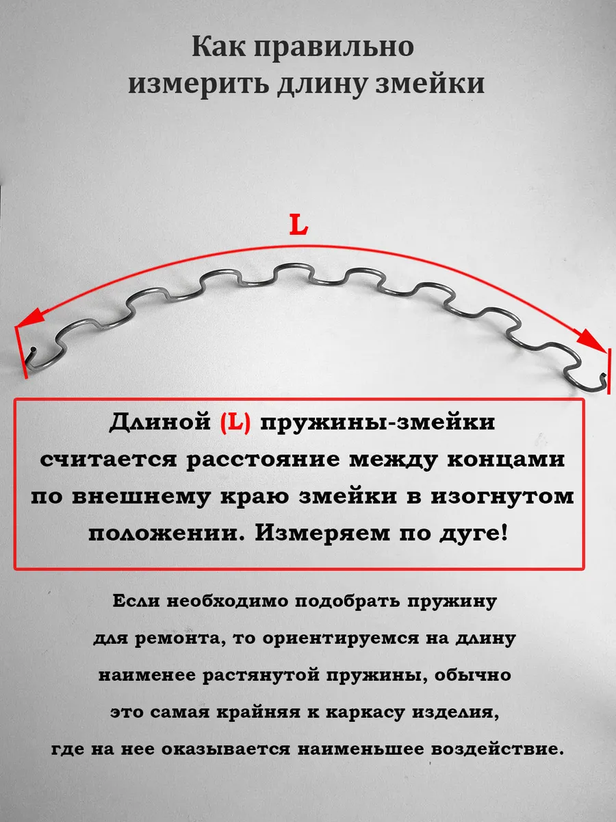 Пружина змейка со временем подвержена растяжению. При подборе длины пружины следует ориентироваться на длину наименее растянутой пружины, обычно это самая крайняя к каркасу изделия, где на нее оказывается наименьшее воздействие.
