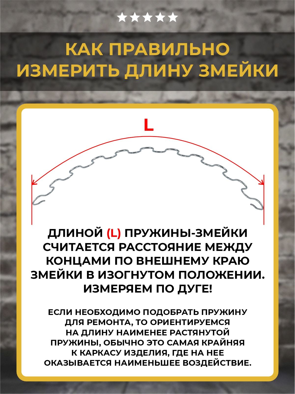Внимание, важная информация! Змейка измеряется в длину по дуге или полностью в выпрямленном состоянии. Пружина змейка со временем подвержена растяжению. При подборе длины пружины следует ориентироваться на длину наименее растянутой пружины, обычно это самая крайняя к каркасу изделия, где на нее оказывается наименьшее воздействие.